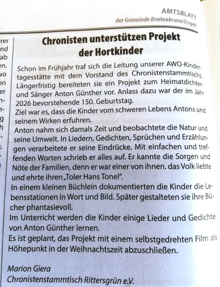 Zur Weihnachtsfeier der Kindertagesstätte in Rittersgrün im Dezember 2025 wurde der Film zu dem Projekt: „Auf den Spuren von Anton Günther“, entstanden unter der Leitung von Claudia Eminger, vorgeführt. Die Kinder, die mit großer Begeisterung an diesem Projekt gearbeitet haben, wurden dafür als Dankeschön seitens der Chronisten zu einem weihnachtlichen Bastelnachmittag eingeladen. Kleine Kekshäuschen entstanden und Glückswürmchen aus Wolle wurden verschenkt.